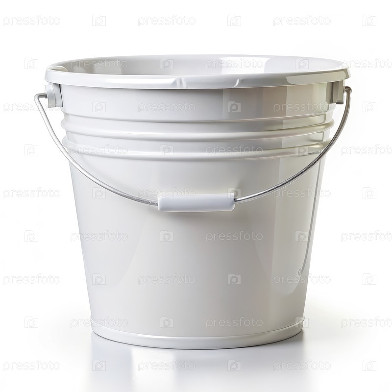 Белая пластиковая ведра с металлической ручкой, изолированная на белом фоне