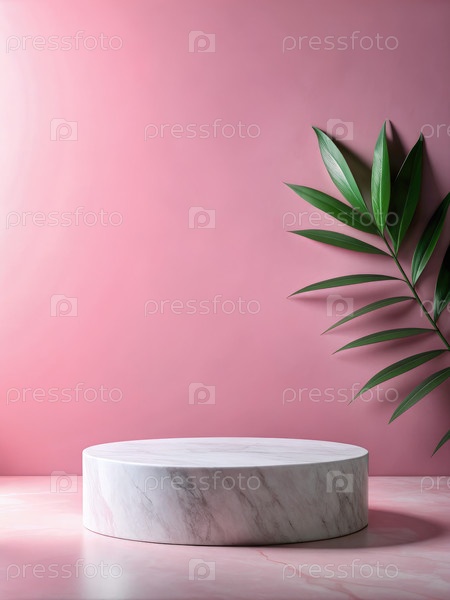 Белый мраморный подиум на зеленом фоне с тенями пальмовых листьев