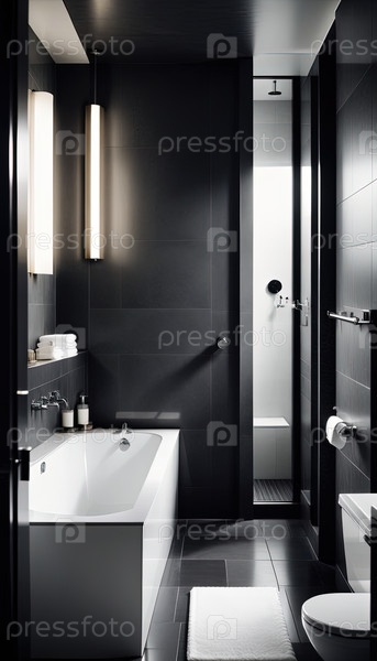 Современная ванная комната со свободно стоящей ванной и черными плиточными стенами