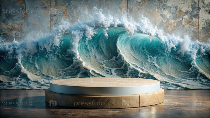 Детальный деревянный подиум с океаническим волновым фоном
