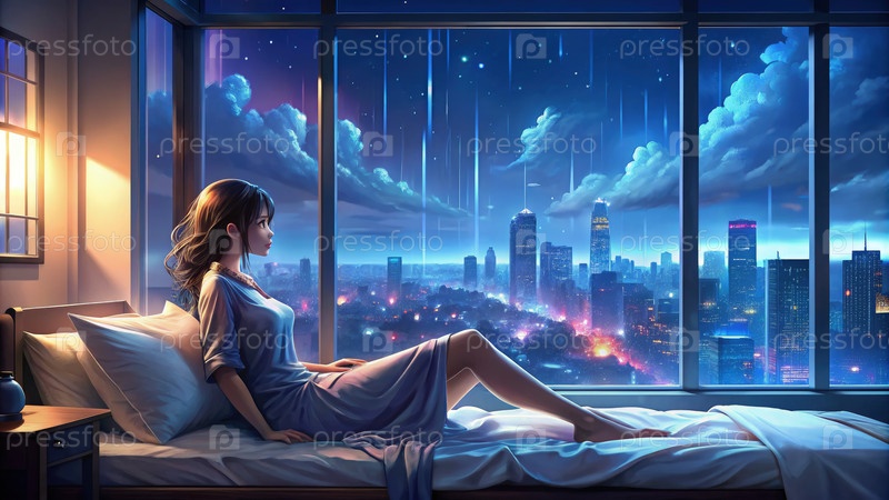 Женщина сидит на кровати и смотрит в окно
