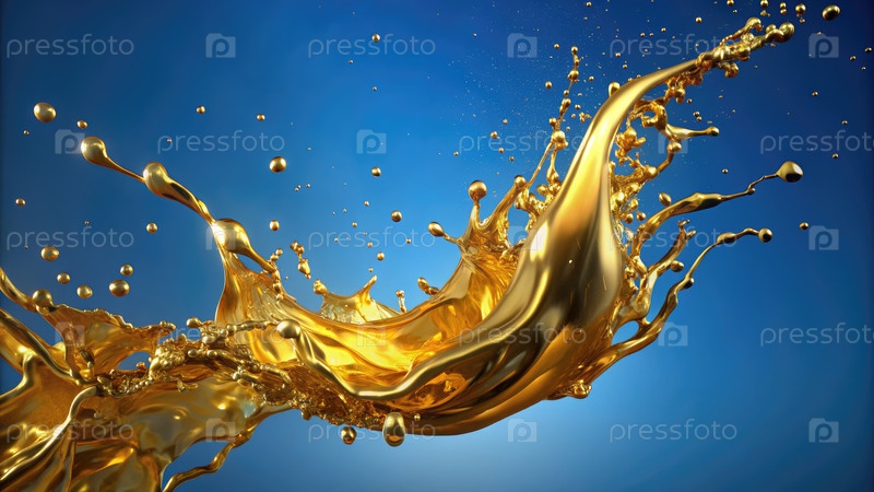 Динамический золотой жидкий брызг на синем фоне. генеративный ИИ