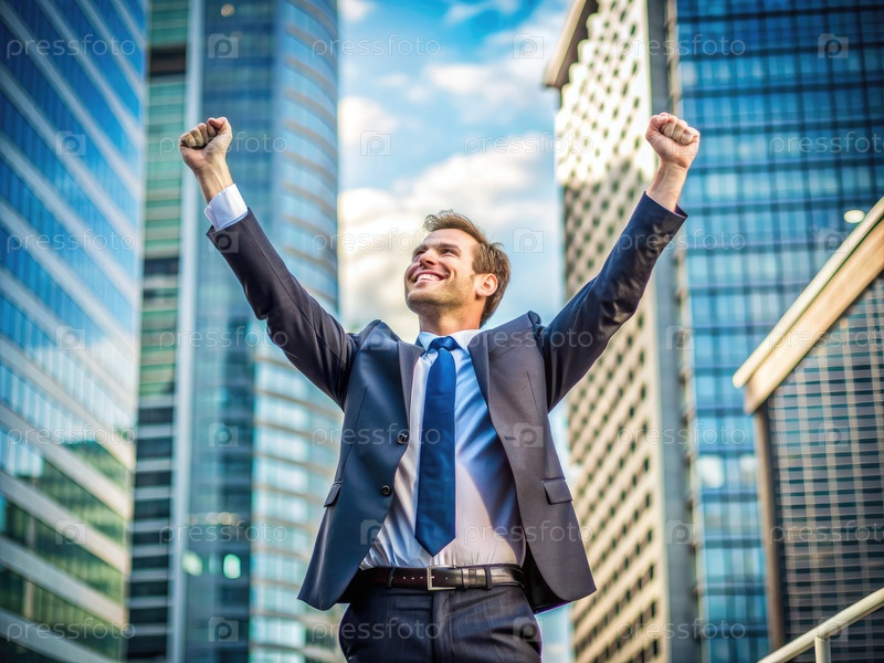 Успешный бизнесмен празднует победу в городской обстановке