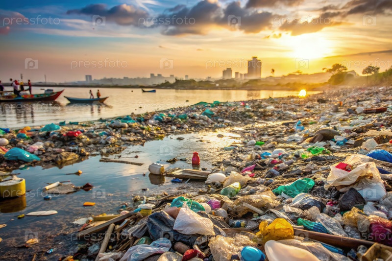 Пластиковое загрязнение откладывает береговую линию на закате