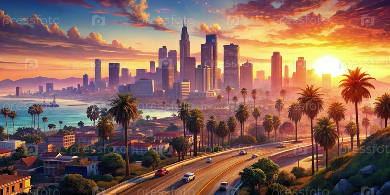 Закат солнца над горизонтом Лос-Анджелеса с пальмами и шоссе