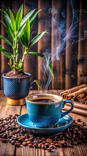 Парная чашка кофе на деревянном столе с зеленым растением и коричневыми палочками