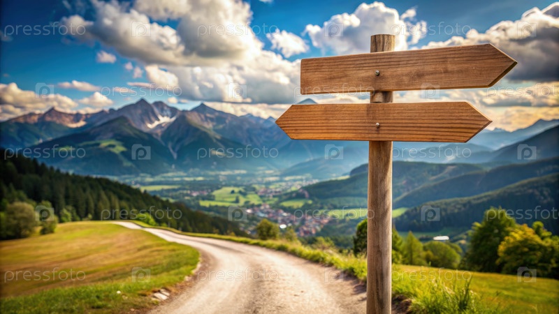 Деревянный указатель на деревенской дорожке с видом на горы