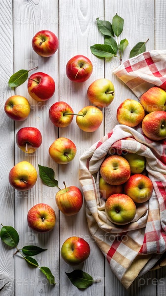 Свежие красные и зеленые яблоки разбросаны по белому деревянному столу с чековой тканью