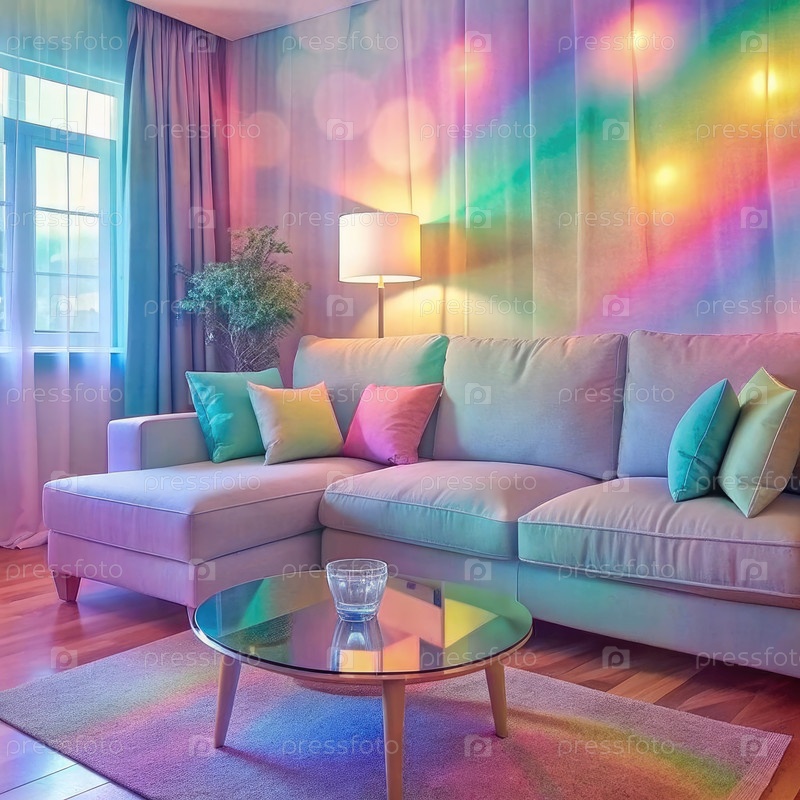 Цветная комната для дизайна интерьера с секционным диваном и радужными огнями