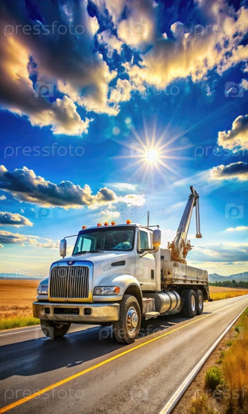 Белый буксирный грузовик едет по сельской дороге под солнечным небом. генеративная ИИ
