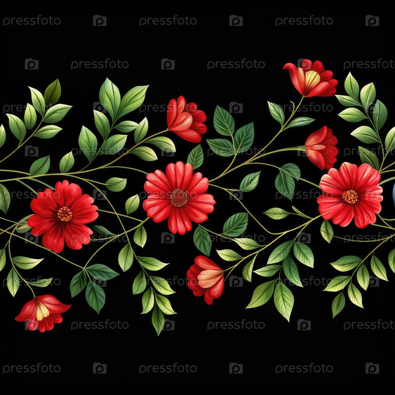 Вибрирующая цветовая гирлянда из красных цветов и зеленых листьев на черном фоне