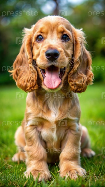 Счастливый щенк английского кокер-спаниеля, сидящий на траве в солнечный день