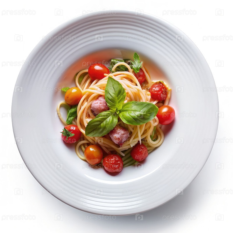 Вид над головой на тарелку спагетти с вишневыми помидорами и базиликом