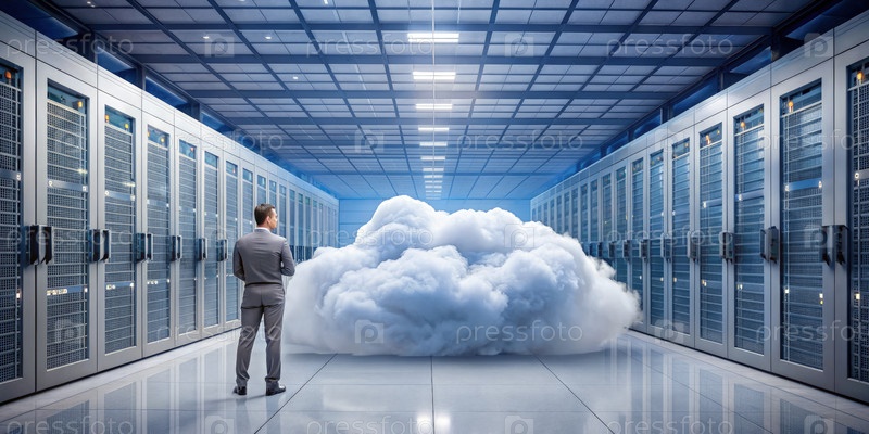 Бизнесмен стоит перед белым облаком в современном центре обработки данных