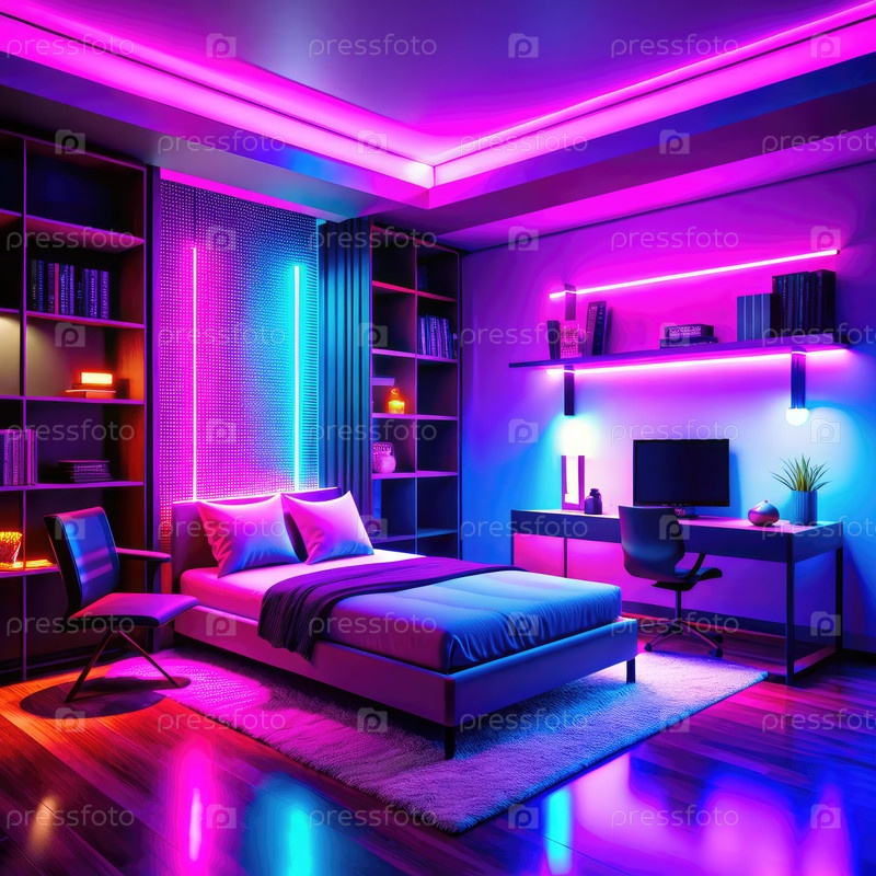 Декорация спальни с неоновыми огнями и книжными шкафами