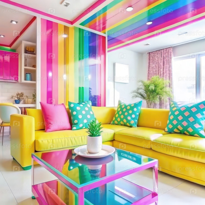 Ярко-желтый секционный диван в гостиной с радужным потолком и стенами