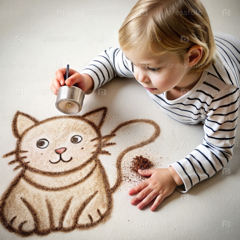 Маленький ребенок сольет кота, рисуя на полу