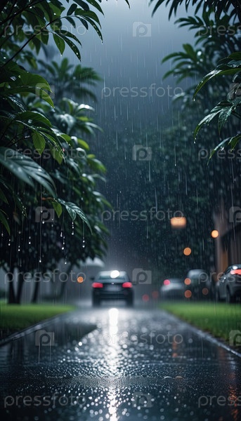 Дождливая вечерняя уличная сцена с автомобилями и фонарями