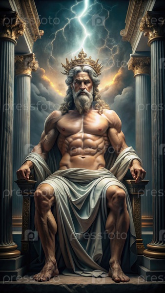 Зевс, король богов, сидит на своем троне в величественном дворце