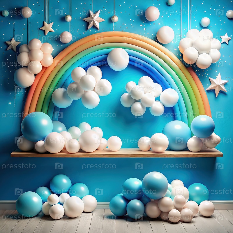 Красочный дисплей воздушного шара с радугой и облаками на синей стене