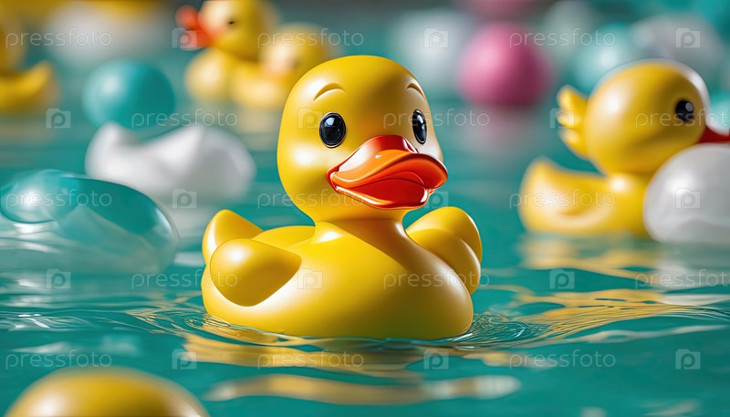 Желтая резиновая утка плавает в голубой воде. генеративный ИИ