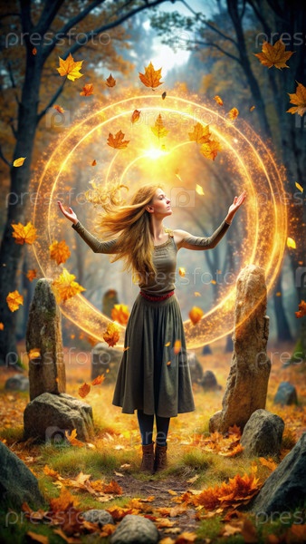 Женщина обнимает осеннюю магию в мистическом лесу