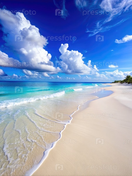 Белый песчаный пляж с голубым океаном и пушистыми облаками в солнечный день