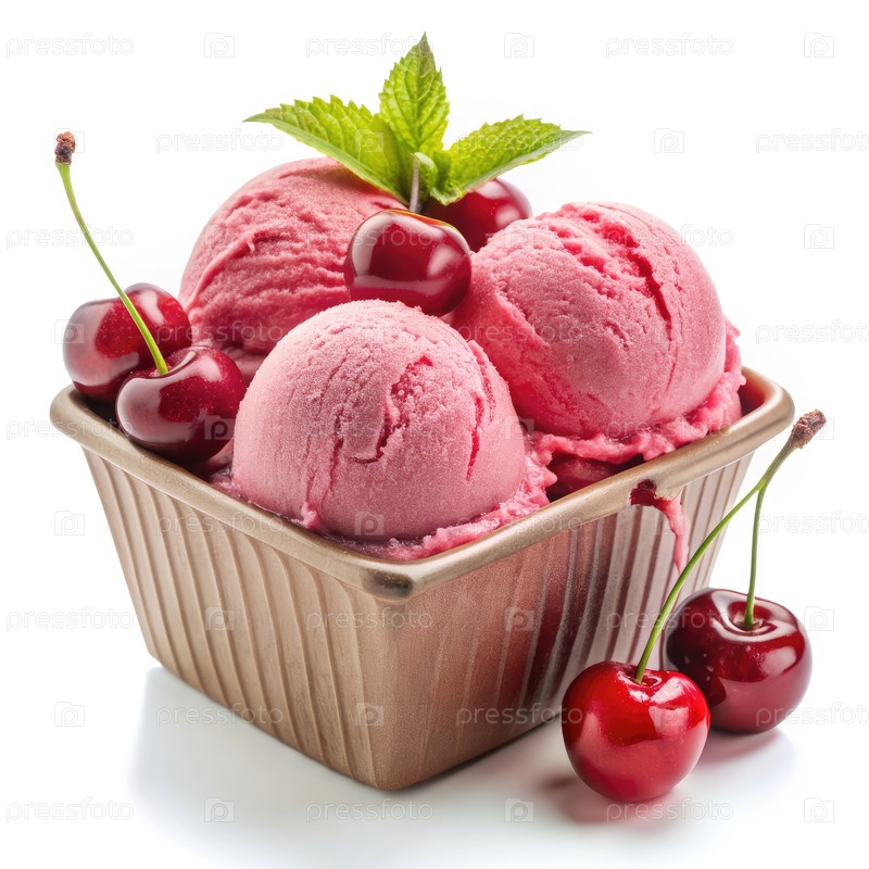 Черри-мороженое лопается в коричневой миске со свежими вишнями