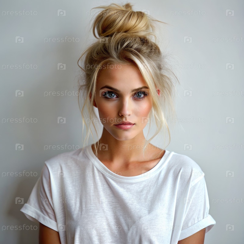 Блондинка с беспорядочной булочкой и белой футболкой позирует на белую стену