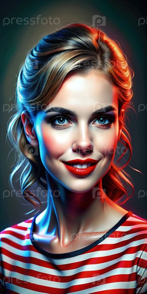 Портрет улыбающейся модели моды с красной полосатой рубашкой и сине-красным освещением
