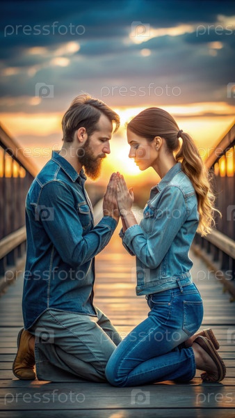 Пара на коленях на мосту при закате солнца, зажатые руки в молитве