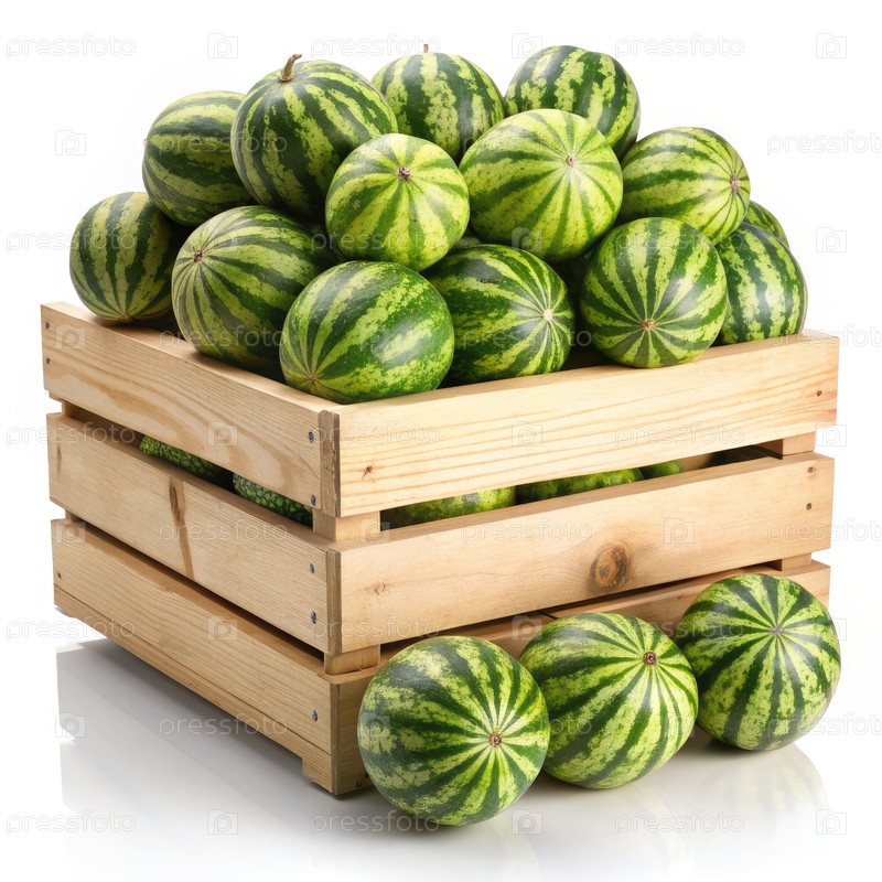 Деревянный ящик, наполненный свежими арбузами на белом фоне