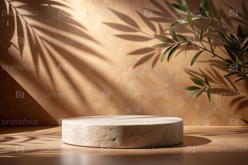 Каменный подиум с тенями пальмовых листьев на коричневом фоне