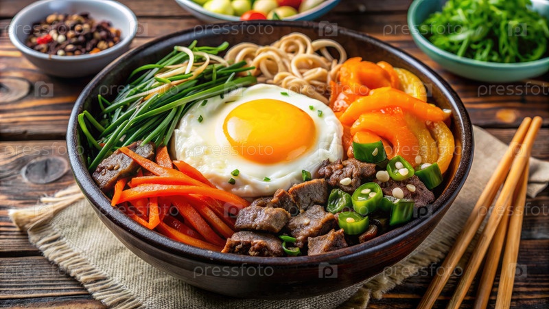 Ближайшее изображение миски бибимбап с жареным яйцом