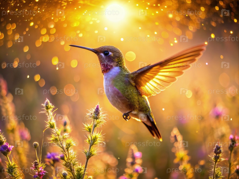 Ирриденсный колибри, паривший в солнечном свете над дикими цветками