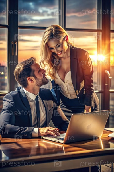 Привлекательная секретарша склоняется над бизнесменом, работающим на ноутбуке в сумерках