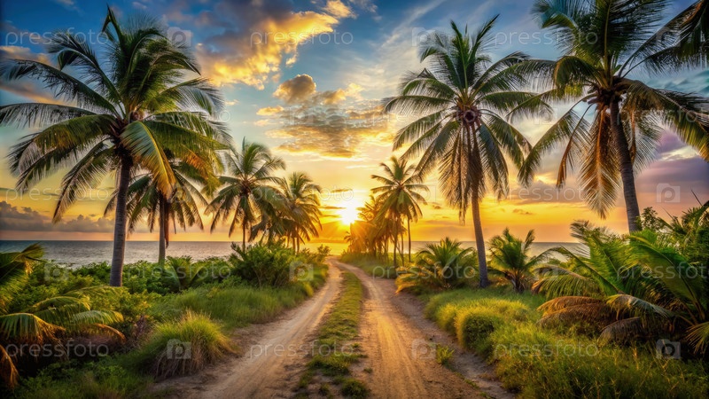 Грязная дорога, окруженная пальмами на закате