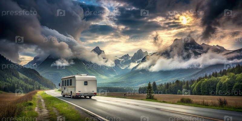 Белый трейлер проезжает через Величественный горный перевал на закате