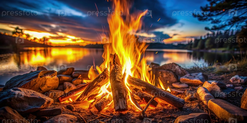 Пламя костра на закате у озера. генеративный ИИ