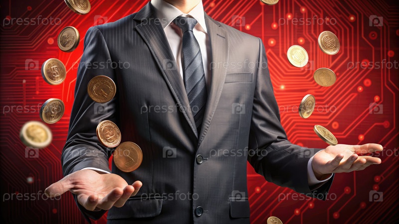 Бизнесмен теряет монеты на фоне красного круга