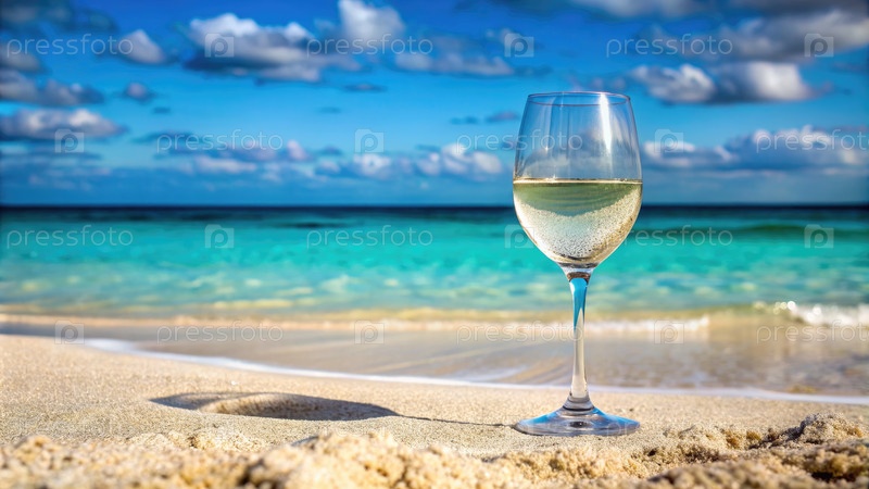 Стакан белого вина на тропическом пляже с бирюзовыми водами и белым песком