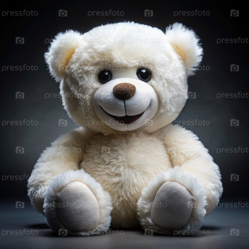 Белый плюшевый медведь сидит на белом фоне с счастливым лицом
