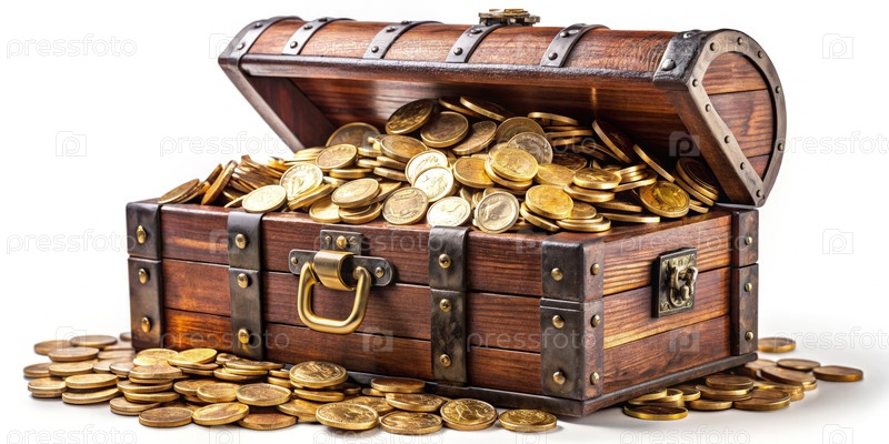 Деревянный сокровищничный ящик переполнен золотыми монетами