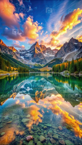 Спокойный восход солнца над горным озером с драматическими отражениями неба