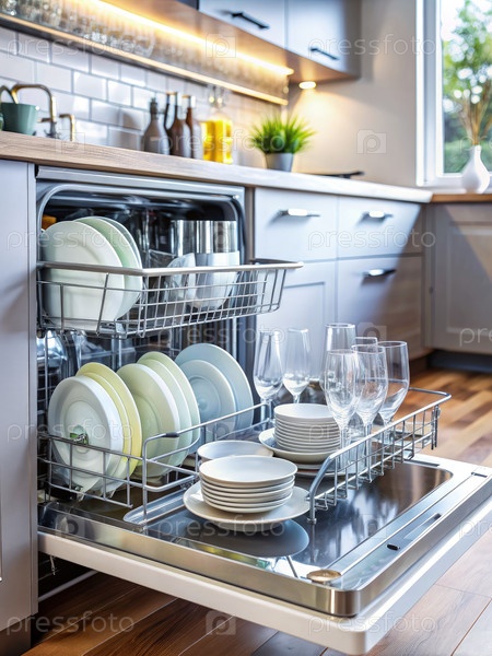 Посудомойка, наполненная посудой в яркой кухне. генеративный ИИ