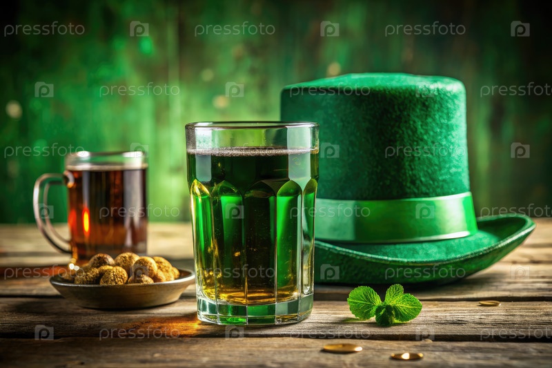 Зеленое пиво, ирландское виски и шляпа лепрекона для празднования Дня Святого Патрика