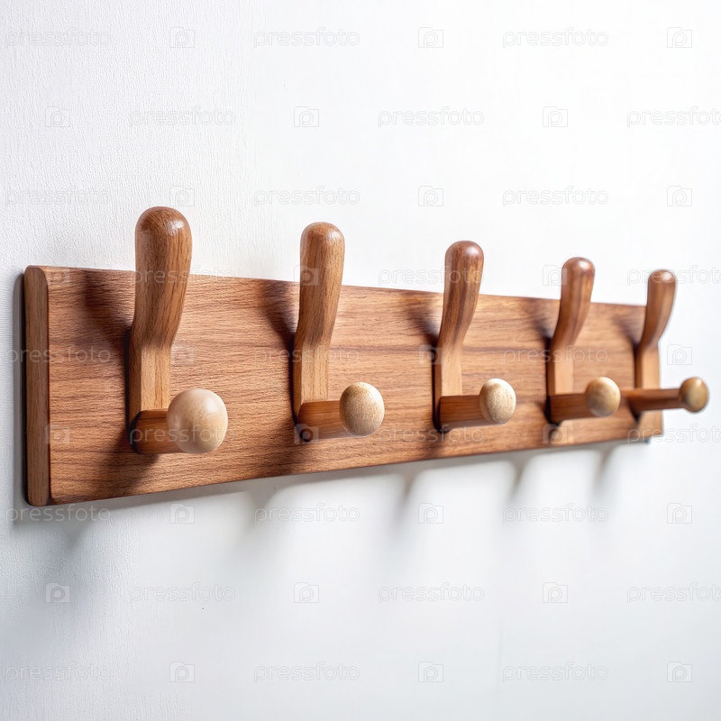 Пять деревянных крючков для пальто, изолированные на белом фоне