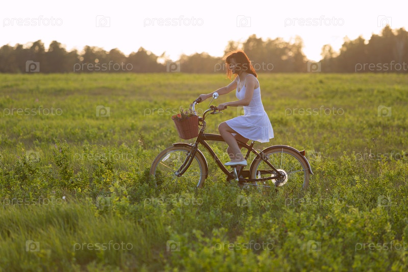 Молодая женщина едет на велосипеде в поле