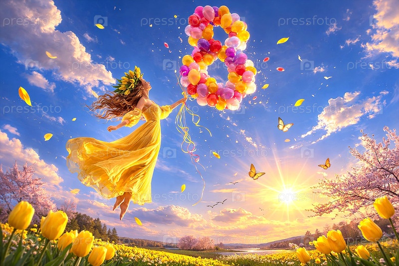 Праздник - Международный женский день 8 марта. Летящая девушка с шарами