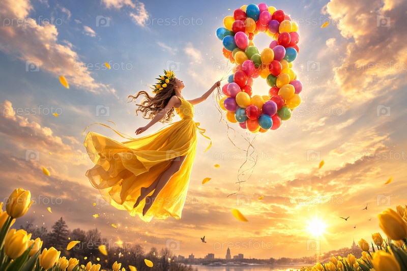 8 марта - Международный Женский день. Летящая с шарами девушка-фея с венком на голове